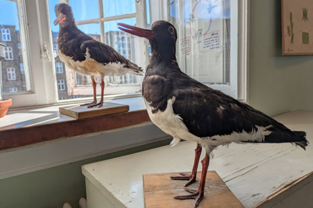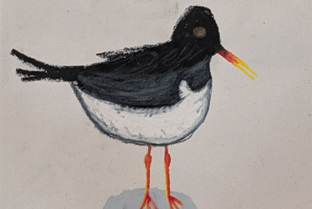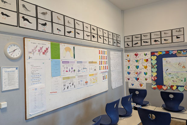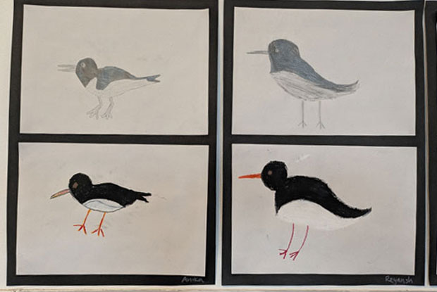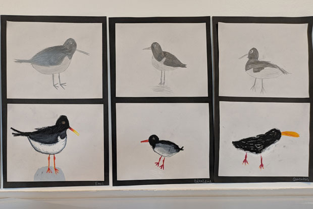 3.y iagttog strandskader – først med oliefarver og dernæst med blyant. Og nu hænger de og kigger på alle lærere og elever i 3.ys klasselokale.