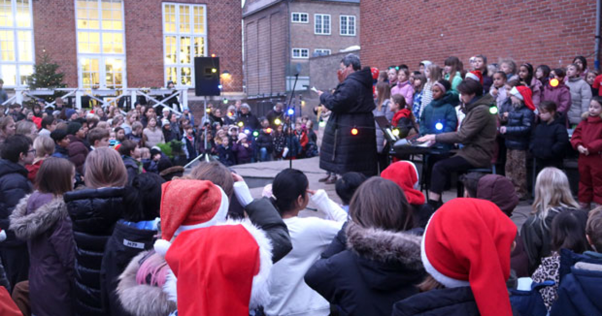 Skoleleder Isabel Let Jensen sagde godmorgen i den endnu mørke skolegård og ønskede alle forældrene som var med, en god jul. Vi sang adventssalmen Hold håbet op, og så var der julemusik og dans inden alle gik til klasserne.